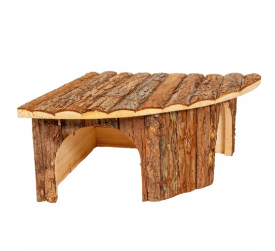 Ett hörnhus tillverkat av obehandlat naturträ som ger smådjur en säker och ombonad plats i buren. Husets design gör att det passar smidigt i ett hörn, vilket frigör yta i resten av buren för lek och aktivitet. Taket i bark ger både ett naturligt utseende och möjlighet för djuret att klättra upp. Konstruktionen är robust och tillverkad utan spik eller giftiga ämnen, vilket gör det säkert att gnaga på. En praktisk lösning som både berikar miljön och uppfyller djurets behov av trygghet.